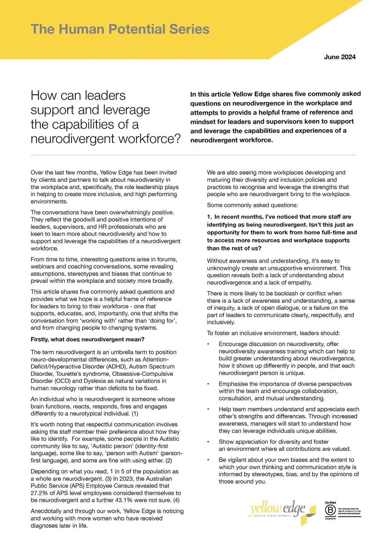 In this article Yellow Edge shares five commonly asked questions on neurodivergence in the workplace and attempts to provide a helpful frame of reference and mindset for leaders and supervisors keen to support and leverage the capabilities and experiences of a neurodivergent workforce.